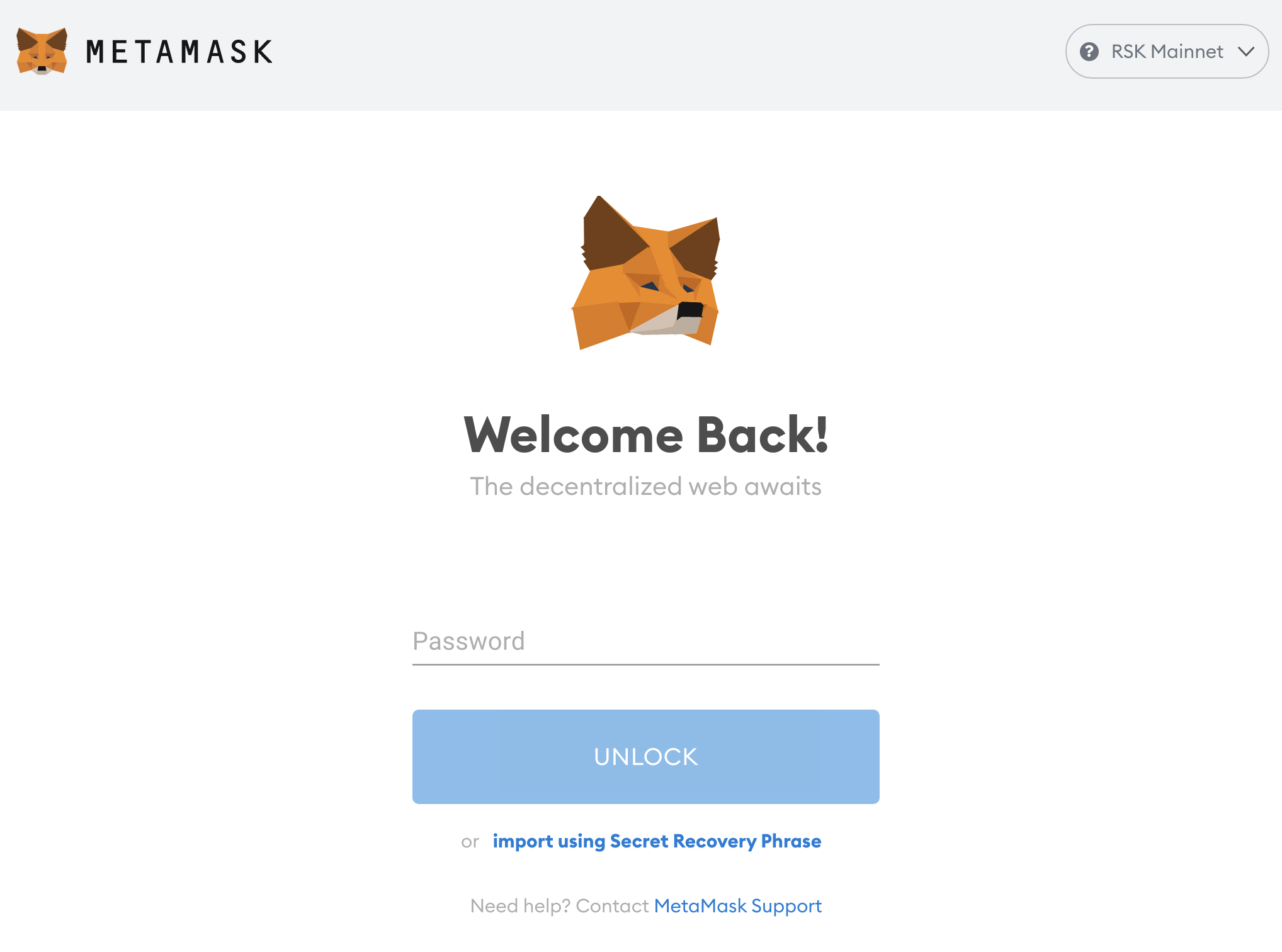 After installing the extension or starting your browser, MetaMask should display a popup asking you to unlock the account. Enter your MetaMask password. (Note that this is not the same as your seed phrase.)